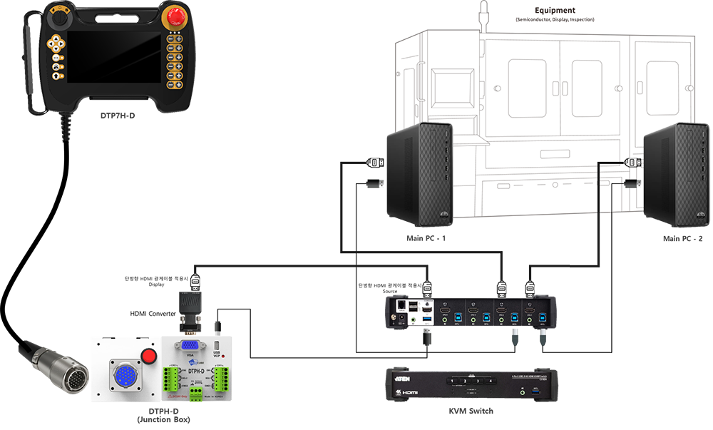KVM Switch 적용 배선도 (다수의 메인 PC 화면 중 하나를 선택하여 확장/복제)